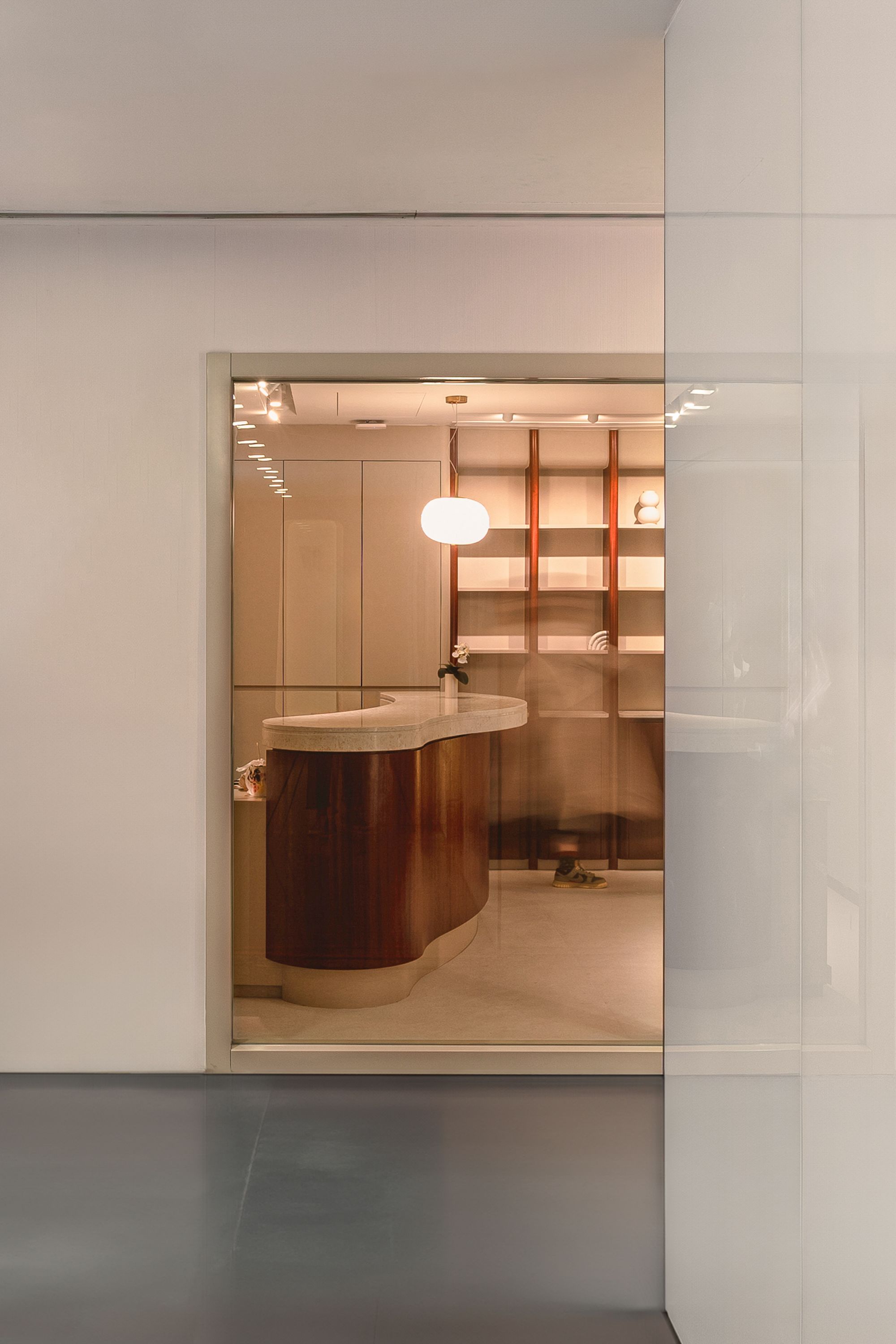 The whole shop is filled with earth tone materials, including environmentally friendly acoustic boards, homogeneous vinyl flooring, upholstered furniture and even touch of greenery, to give colors and texture to the space while absorbing sound reflection at the same time. Full height curvatures are express in columns, while small one are in built-in shelves, expressing the continuous flow of beauty and health between the inside and out.